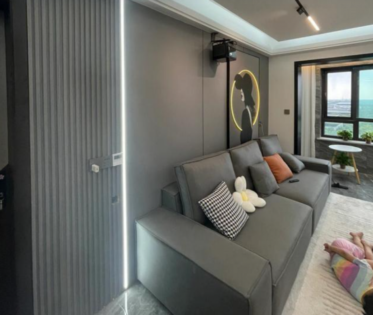 做了簡單的電視背景墻,設計了格柵,效果還是蠻不錯的。而且還加了線條燈裝飾,可以起到很好的氛圍效果,看著都很有檔次。而且還安裝了投影儀,以后可以方便使用。感受家庭影院的感覺!